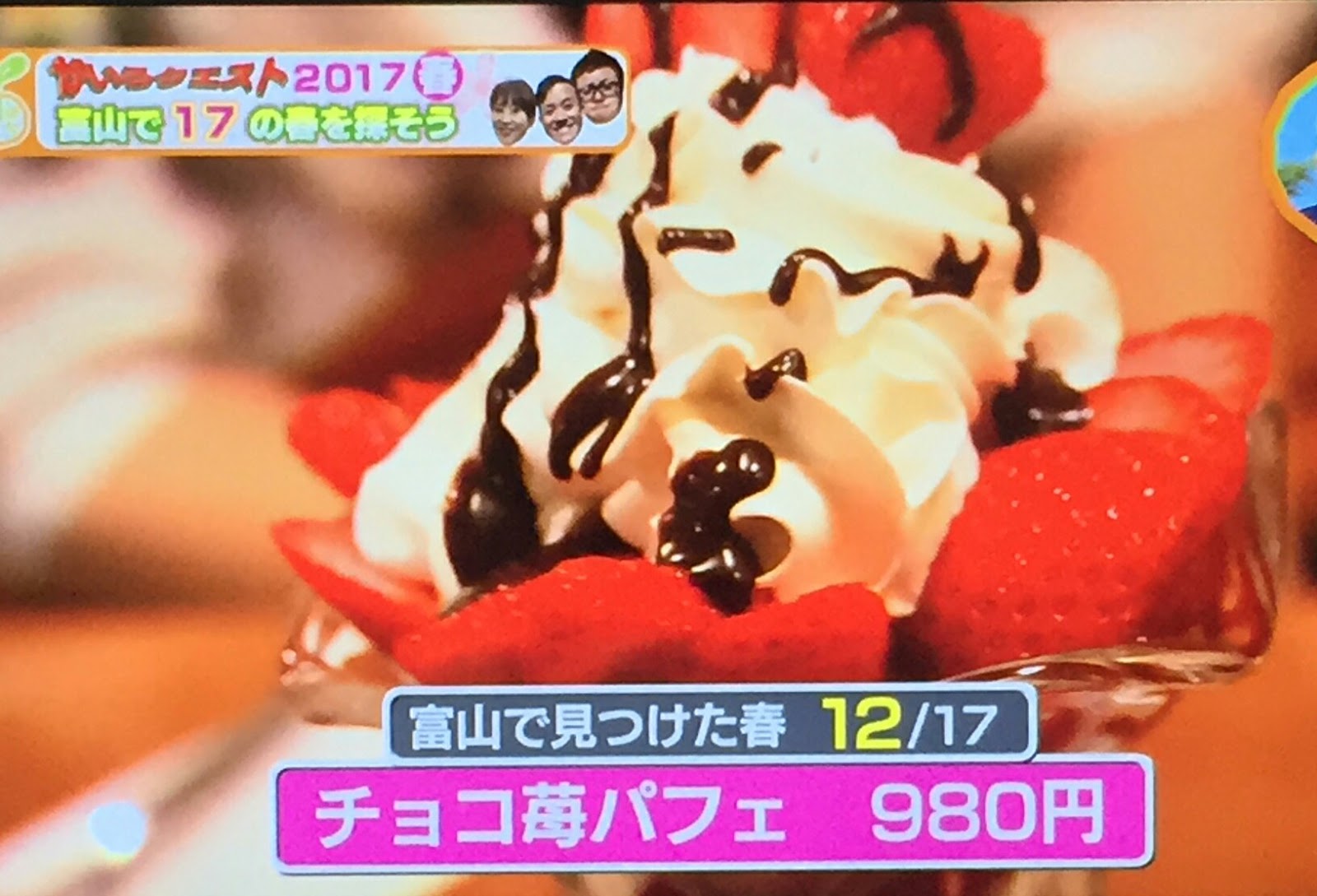 2017年3月15日 / 最終更新日時 : 2017年10月19日 cheerio メディア掲載 北日本放送『ゼロいち』にチェリオ登場しました♪ 3月5日のKNB北日本放送『ゼロいち』にチェリオが登場致しました。 柴田アナとフイッシュ&チップスのお二人がご来店。 そして今回取材されたのは【チョコ苺パフェ】! 昨年から販売を開始して今シーズンで二年目。おかげさまで着々と支持を伸ばしております。 そんなこんなで、テレビにも初登場。 これからもチェリオの【チョコ苺パフェ】! よろしくお願い致します♪