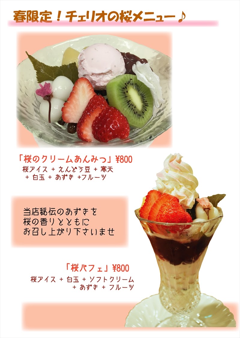 2017年4月1日 / 最終更新日時 : 2017年6月19日 cheerio おすすめ商品のご案内 【桜パフェ・桜クリームあんみつ】の販売を開始致しました♪ 冬の寒さもやわらいで少しづつ春らしくなってきましたね。 春と言えば!チェリオの桜メニュー♪ というわけで、桜メニューの販売を開始致しました。 4月いっぱいまでの期間限定商品となっております。 ぜひチェリオで桜の香りを満喫して下さいませ。
